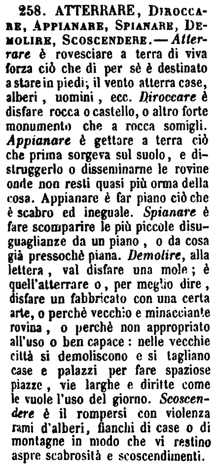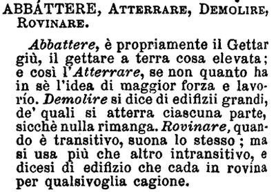 | Abbattere, Atterrare, Demolire, Rovinare - Abbattere, è propriamente il Gettar giù, il gettare a terra cosa elevata; e così l'Atterrare, se non quanto ha in sé l'idea di maggior forza e lavorío. Demolire si dice di edifizii grandi, de' quali si atterra ciascuna parte, sicchè nulla rimanga. Rovinare, quando è transitivo, suona lo stesso; ma si usa più che altro intransitivo, e dicesi di edifizio che cada in rovina per qualsivoglia cagione. [immagine] |