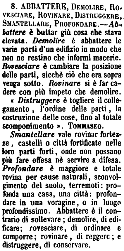 Smantellare vale rovinar fortezze, castelli o città fortificate nelle loro parti forti, onde non possano più fare offesa nè servire a difesa. Profondare è maggiore e totale rovina per cause naturali, sconvolgimento del suolo, terremoti: profonda una casa, una città: profondare in una voragine, o in luogo profondissimo. Abbattere è il contrario di sollevare; demolire, di edificare; rovesciare, di ordinare e comporre; rovinare, di reggere; e distruggere, di conservare. [immagine] |