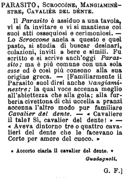 Parasito, Scroccone, Mangiaminestre, Cavalier del dente - Il Parasito è assiduo a una tavola, vi si fa invitare e vi si mantiene coi suoi atti ossequiosi e cerimoniosi. - Lo Scroccone anela a questo e quel pasto, si studia di buscar desinari, colazioni, inviti a bere e simili. Fu scritto e si scrive anch'oggi Parassito; ma è più comune con una sola esse ed è così più consono alla sua origine greca. - [Familiarmente il Parasito suol dirsi anche Mangiaminestre; la qual voce accenna meglio all'abiettezza che alla gola; alla furberia civettona di chi uccella a pranzi accenna l'altro modo pur familiare Cavalier del dente. - «Cavaliere il tale? Sì, cavalier del dente!» - «Aveva dintorno tre o quattro cavalieri del dente che le facevano la Corte per amore del cuoco.»