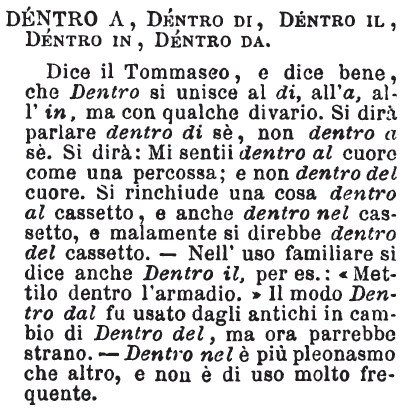| Dentro a, Dentro di, Dentro il, Dentro in, Dentro da - Dice il Tommaseo, e dice bene, che Dentro si unisce al di, all'a, all'in, ma con qualche divario. Si dirà parlare dentro di sè, non dentro a sè. Si dirà: Mi sentii dentro al cuore come una percossa; e non dentro del cuore. Si rinchiude una cosa dentro al cassetto, e anche dentro nel cassetto, e malamente si direbbe dentro del cassetto. - Nell'uso familiare si dice anche Dentro il, per es.: «Mettilo dentro l'armadio.» Il modo Dentro dal fu usato dagli antichi in cambio di Dentro del, ma ora parrebbe strano. - Dentro nel è più pleonasmo che altro, e non è di uso molto frequente. [immagine] |