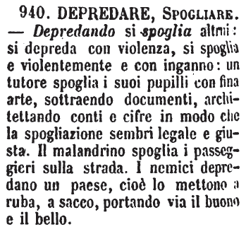 | Depredare, Spogliare - Depredando si spoglia altrui: si depreda con violenza, si spoglia e violentemente e con inganno: un tutore spoglia i suoi pupilli con fina arte, sottraendo documenti, architettando conti e cifre in modo che la spogliazione sembri legale e giusta. Il malandrino spoglia i passeggieri sulla strada. I nemici depredano un paese, cioè lo mettono a ruba, a sacco, portando via il buono e il bello. [immagine] |