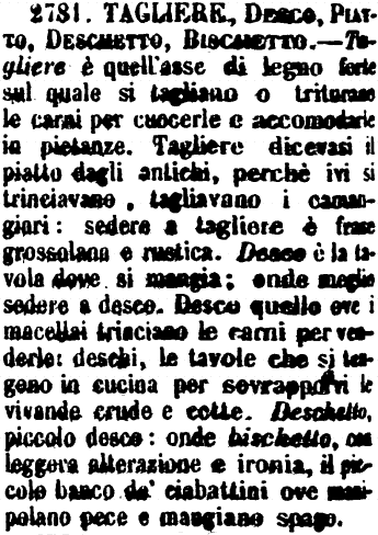 | Tagliere, Desco, Piatto, Deschetto, Bischetto - Tagliere è quell'asse di legno forte sul quale si tagliano o triturano le carni per cuocerle e accomodarle in pietanze. Tagliere dicevasi il piatto dagli antichi, perchè ivi si trinciavano, tagliavano i camangiari: sedere a tagliere è frase grossolana e rustica. Desco è la tavola dove si mangia; onde meglio sedere a desco. Desco quello ove i macellai trinciano le carni per venderle: deschi, le tavole che si tengono in cucina per sovrapporvi le vivande crude e cotte. Deschetto, piccolo desco: onde bischetto, con leggera alterazione e ironia, il piccolo banco de' ciabattini ove manipolano pece e mangiano spago. [immagine] |