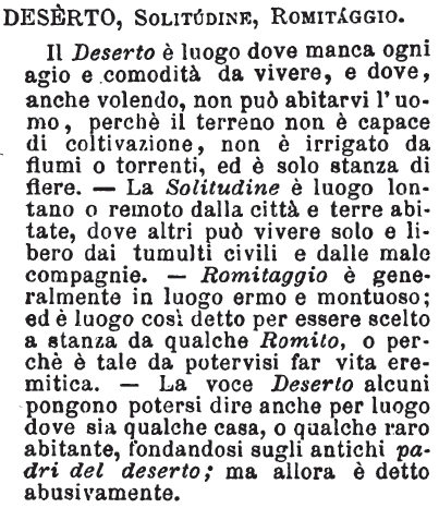| Deserto, Solitudine, Romitaggio - Il Deserto è luogo dove manca ogni agio e comodità da vivere, e dove, anche volendo, non può abitarvi l'uomo, perchè il terreno non è capace di coltivazione, non è irrigato da fiumi o torrenti, ed è solo stanza di fiere. - La Solitudine è luogo lontano o remoto dalla città e terre abitate, dove altri può vivere solo e libero dai tumulti civili e dalle male compagnie. - Romitaggio è generalmente in luogo ermo e montuoso; ed è luogo così detto per essere scelto a stanza da qualche Romito, o perchè è tale da potervisi far vita eremitica. - La voce Deserto alcuni pongono potersi dire anche per luogo dove sia qualche casa, o qualche raro abitante, fondandosi sugli antichi padri del deserto; ma allora è detto abusivamente. [immagine] |
