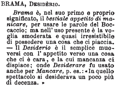 | Brama, Desiderio - Brama è, nel suo primo e proprio significato, il bestiale appetito di manicare, per usare le parole del Boccaccio; ma nell'uso presente è la voglia smoderata e quasi irresistibile di possedere una cosa che ci piaccia. - Il Desiderio è il semplice muoversi con l'appetito verso una cosa che ci è cara, e la cui mancanza ci dispiace; onde Desiderare fu usato anche per Mancare, p. es:« In quello spettacolo si desiderava un poco più di decenza. » [immagine] |