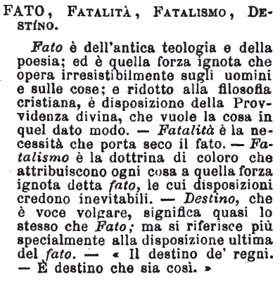 | Fato, Fatalità, Fatalismo, Destino - Fato è dell'antica teologia e della poesia; ed è quella forza ignota che opera irresistibilmente sugli uomini e sulle cose; e ridotto alla filosofia cristiana, è disposizione della Provvidenza divina, che vuole la cosa in quel dato modo. - Fatalità è la necessità che porta seco il fato. - Fatalismo è la dottrina di coloro che attribuiscono ogni cosa a quella forza ignota detta fato, le cui disposizioni credono inevitabili. - Destino, che è voce volgare, significa quasi lo stesso che Fato; ma si riferisce più specialmente alla disposizione ultima del fato. - «Il destino de' regni. - E' destino che sia così. » [immagine] |