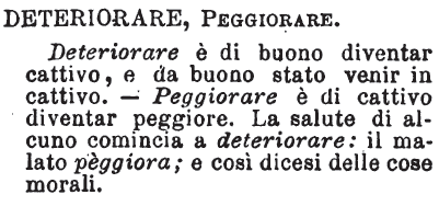 | Deteriorare, Peggiorare - Deteriorare è di buono diventar cattivo, e da buono stato venir in cattivo. - Peggiorare è di cattivo diventar peggiore. La salute di alcuno comincia a deteriorare: il malato pèggiora; e così dicesi delle cose morali. [immagine] |