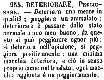 | Deteriorare, Peggiorare - Deteriora una merce in qualità; peggiora un ammalato: deteriorare è passare dallo stato normale a uno men buono; da questo si può peggiorare ognor più: si deteriora nell'opinione, si peggiora positivamente: una minima macchia deteriora, e ciò in senso proprio come nel traslato; ogni macchia aggiunta è un peggioramento. [immagine] |