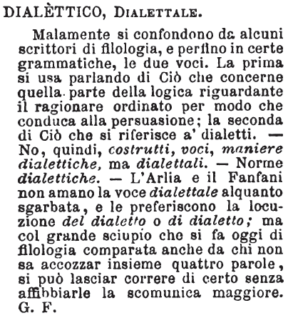 | Dialettico, Dialettale - Malamente si confondono da alcuni scrittori di filologia, e perfino in certe grammatiche, le due voci. La prima si usa parlando di Ciò che concerne quella parte della logica riguardante il ragionare ordinato per modo che conduca alla persuasione; la seconda di Ciò che si riferisce a' dialetti. - No, quindi, costrutti, voci, maniere dialettiche, ma dialettali. - Norme dialettiche. - L'Arlia e il Fanfani non amano la voce dialettale alquanto sgarbata, e le preferiscono la locuzione del dialetto o di dialetto; ma col grande sciupio che si fa oggi di filologia comparata anche da chi non sa accozzar insieme quattro parole, si può lasciar correre di certo senza affibbiarle la scomunica maggiore. G. F. [immagine] |