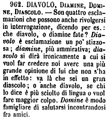 | Diavolo, Diamine, Domine, Diascolo - Son quattro esclamazioni che possono anche rivolgersi in interrogazione, dicendo per es.: che diavolo, o diamine fate? Diavolo è esclamazione un po' stizzosa; diamine, più ammirativa; diascolo si dirà ironicamente a cui si vuol far credere noi avere una più grande opinione di lui che non s'ha in effetto: va là che sei un gran diascolo; o anche diavolo, se chi lo dice è più sciolto di lingua o vuol fare maggior colpo. Domine è modo famigliare di salutarsi incontrandosi fra amici. [immagine] |