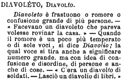| Diavoleto, Diavolio - Diavoleto è frastuono o romore o confusione grande di più persone. - «Facevano un diavoleto che pareva volesse rovinar la casa.» - Quando il romore è un poco più temperato o di sole voci, si dice Diavolío; la qual voce si tira anche a significare numero grande, ma con idea di confusione e disordine, di persone e anche di cose. - «C'era un diavolío di soldati. - Lasciò un diavolío di libri. » [immagine] |