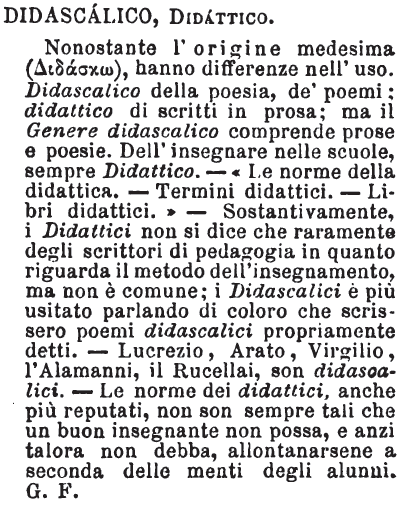 | Didascalico, Didattico - Nonostante l'origine medesima (Διδάσχω), hanno differenze nell'uso. Didascalico della poesia, de' poemi; didattico di scritti in prosa; ma il Genere didascalico comprende prose e poesie. Dell'insegnare nelle scuole, sempre Didattico. - « Le norme della didattica. - Termini didattici. - Libri didattici. » - Sostantivamente, i Didattici non si dice che raramente degli scritti di pedagogia in quanto riguarda il metodo dell'insegnamento, ma non è comune; i Didascalici è più usitato parlando di coloro che scrissero poemi didascalici propriamente detti. - Lucrezio, Arato, Virgilio, l'Alamanni, il Rucellai, son didascalici. - Le norme dei didattici, anche più reputati, non son sempre tali che un buon insegnante non possa, e anzi talora non debba, allontanarsene a seconda delle menti degli alunni. G. F. [immagine] |