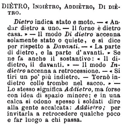 | Dietro, Indietro, Addietro, Di dietro - Dietro indica stato e moto. - «Andar dietro a uno. - Il forno è dietro casa.» - Il modo Di dietro accenna solamente stato o quiete, e si dice per rispetto a Davanti. - «La parte di dietro, e la parte d'avanti.» Se ne fa anche il sostantivo: «Il didietro, il davanti.» - Il modo Indietro accenna a retrocessione. - «Si tiri un pò più indietro. - Tornò indietro colle trombe nel sacco.» - Lo stesso significa Addietro, ma forse con idea di spazio minore; e in una calca si odono spesso i soldati dire alla gente accalcata: Addietro; per invitarla a retrocedere qualche poco e far luogo a chi passa. [immagine] |
