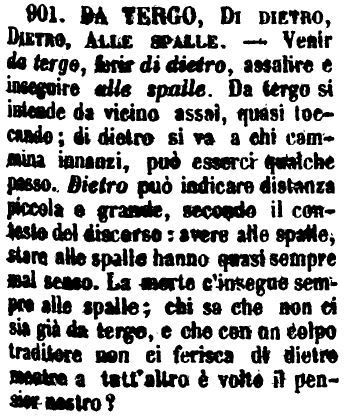 | Da tergo, Di dietro, Dietro alle spalle - Venir da tergo, ferir di dietro, assalire e inseguire alle spalle. Da tergo si intende da vicino assai, quasi toccando; di dietro si va a chi cammina innanzi, può esserci qualche passo. Dietro può indicare distanza piccola o grande, secondo il contesto del discorso: avere alle spalle, stare alle spalle hanno quasi sempre mal senso. La morte c'insegue sempre alle spalle; chi sa che non ci sia già da tergo, e che con un colpo traditore non ci ferisca di dietro mentre a tutt'altro è volto il pensier nostro? [immagine] |