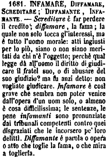| Infamare, Diffamare, Screditare; Diffamante, Infamante - Screditare è far perdere il credito; diffamare, la fama; la quale non solo tocca gl'interessi, ma è tutto l'uomo morale: atti ingiusti per lo più, siano o non siano meritati da chi n'è l'oggetto; perchè qual legge dà all'uomo il diritto di giudicare il fratel suo, o di abusare del suo giudizio? ma fu anzi detto: non vogliate giudicare. Infamare è così grave che sembra non poter venire dall'opera d'un uom solo, o almeno è cosa difficilissima; le sentenze, le pene infamanti sono pronunziate dai tribunali competenti contro quei disgraziati che le incorsero pe' loro delitti. Diffamante è parola o opera o atto che toglie la fama, o che mira a toglierla. [immagine] |