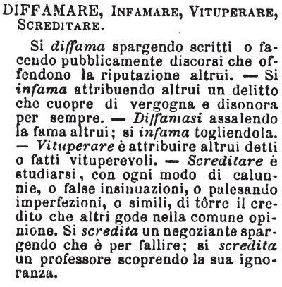 | Diffamare, Infamare, Vituperare, Screditare - Si diffama spargendo scritti o facendo pubblicamente discorsi che offendono la riputazione altrui. - Si infama attribuendo altrui un delitto che cuopre di vergogna e disonora per sempre. - Diffamasi assalendo la fama altrui; si infama togliendola. - Vituperare è attribuire altrui detti o fatti vituperevoli. - Screditare è studiarsi, con ogni modo di calunnie, o false insinuazioni, o palesando imperfezioni, o simili, di tôrre il credito che altri gode nella comune opinione. Si scredita un negoziante spargendo che è per fallire; si scredita un professore scoprendo la sua ignoranza. [immagine] |