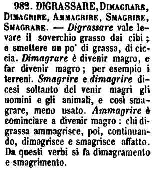 | Digrassare, Dimagrare, Dimagrire, Ammagrire, Smagrire, Smagrare - Digrassare vale levare il soverchio grasso dai cibi e smettere un po' di grassa, di ciccia. Dimagrare è divenir magro, e far divenir magro; per esempio i terreni. Smagrire e dimagrire dicesi soltanto del venir magri gli uomini e gli animali, e così smagrare, meno usato. Ammagrire è cominciare a divenir magro: chi digrassa ammagrisce, poi, continuando, dimagrisce e smagrisce affatto. Da questi verbi si fa dimagramento e smagrimento. [immagine] |