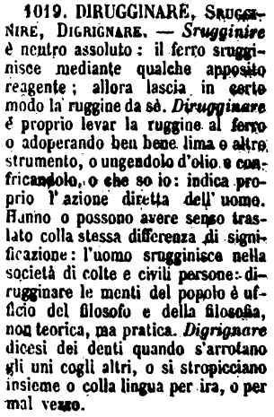 | Dirugginare, Srugginire, Digrignare - Srugginire è neutro assoluto: il ferro srugginisce mediante qualche apposito reagente; allora lascia in certo modo la ruggine da sè. Dirugginare è proprio levar la ruggine al ferro o adoperando ben bene lima o altro strumento, o ungendolo d'olio e confricandolo, o che so io: indica proprio l'azione diretta dell'uomo. Hanno o possono avere senso traslato colla stessa differenza di significazione: l'uomo srugginisce nella società di colte e civili persone: dirugginare le menti del popolo è ufficio del filosofo e della filosofia, non teorica, ma pratica. Digrignare dicesi dei denti quando s'arrotano gli uni cogli altri, o si stropicciano insieme o colla lingua per ira, o per mal vezzo. [immagine] |