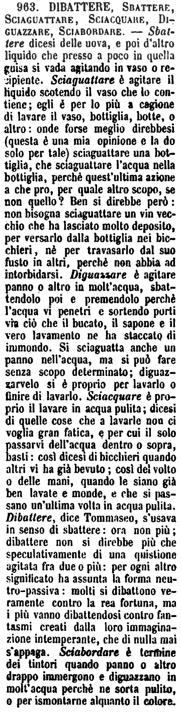 | Dibattere, Sbattere, Sciaguattare, Sciacquare, Diguazzare, Sciabordare - Sbattere dicesi delle uova, e poi d'altro liquido che presso a poco in quella guisa si vada agitando in vaso o recipiente. Sciaguattare è agitare il liquido scotendo il vaso che lo contiene; egli è per lo più a cagione di lavare il vaso, bottiglia, botte, o altro: onde forse meglio direbbesi (questa è una mia opinione e la do solo per tale) sciaguattare una bottiglia, che sciaguattare l'acqua nella bottiglia, perchè quest'ultima azione a che pro, per quale altro scopo, se non quello? Ben si direbbe però: non bisogna sciaguattare un vin vecchio che ha lasciato molto deposito, per versarlo dalla bottiglia nei bicchieri, nè per travasarlo dal suo fusto in altri, perchè non abbia ad intorbidarsi. Diguazzare è agitare panno o altro in molt'acqua, sbattendolo poi e premendolo perchè l'acqua vi penetri e sortendo porti via ciò che il bucato, il sapone e il vero lavamento ne ha staccato di immondo. Si sciaguatta anche un panno nell'acqua, ma si può fare senza scopo determinato; diguazzarvelo si è proprio per lavarlo o finire di lavarlo. Sciacquare è proprio il lavare in acqua pulita; dicesi di quelle cose che a lavarle non ci voglia gran fatica, e per cui il solo passavi dell'acqua dentro o sopra, basti: così dicesi di bicchieri quando altri vi ha già bevuto; così del volto o delle mani, quando le siano già ben lavate e monde, e che si passano un'ultima volta in acqua pulita. Dibattere, dice Tommaseo, s'usava in senso di sbattere: ora non più; dibattere non si direbbe più che speculativamente di una quistione agitata fra due o più: per ogni altro significato ha assunta la forma neutro-passiva: molti si dibattono veramente contro la rea fortuna, ma i più vanno dibattendosi contro fantasmi creati dalla loro immaginazione intemperante, che di nulla mai s'appaga. Sciabordare è termine dei tintori quando panno o altro drappo immergono e diguazzano in molt'acqua perchè ne sorta pulito, o per ismontarne alquanto il colore. [immagine] |
