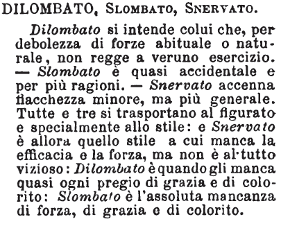 | Dilombato, Slombato, Snervato - Dilombato si intende colui che, per debolezza di forze abituale o naturale, non regge a veruno esercizio. - Slombato è quasi accidentale e per più ragioni. - Snervato accenna fiacchezza minore, ma più generale. Tutte e tre si trasportano al figurato e specialmente allo stile: e Snervato è allora quello stile a cui manca la efficacia e la forza, ma non è al tutto vizioso: Dilombato è quando gli manca quasi ogni pregio di grazia e di colorito: Slombato è l'assoluta mancanza di forza, di grazia e di colorito. [immagine] |