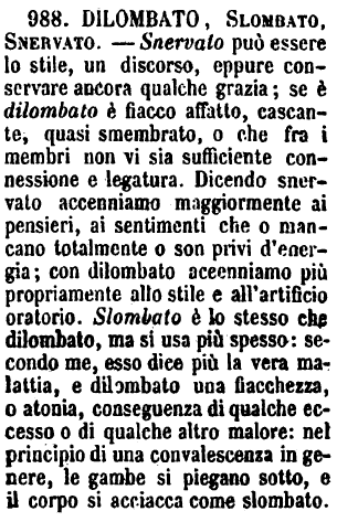 | Dilombato, Slombato, Snervato - Snervato può essere lo stile, un discorso, eppure conservare ancora qualche grazia; se è dilombato è fiacco affatto, cascante, quasi smembrato, o che fra i membri non vi sia sufficiente connessione e legatura. Dicendo snervato accenniamo maggiormente ai pensieri, ai sentimenti che o mancano totalmente o son privi d'energia; con dilombato accenniamo più propriamente allo stile e all'artificio oratorio. Slombato è lo stesso che dilombato, ma si usa più spesso: secondo me, esso dice più la vera malattia, e dilombato una fiacchezza, o atonia, conseguenza di qualche eccesso o di qualche altro malore: nel principio di una convalescenza in genere, le gambe si piegano sotto, e il corpo si acciacca come slombato. [immagine] |