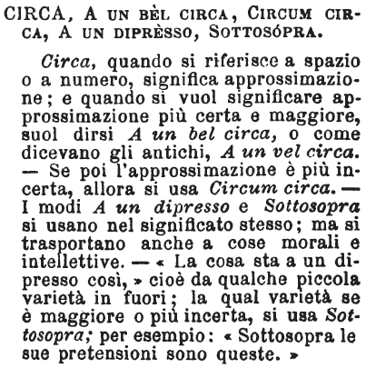 | Circa, A un bel circa, Circum circa, A un dipresso, Sottosopra - Circa, quando si riferisce a spazio o a numero, significa approssimazione; e quando si vuol significare approssimazione più certa e maggiore, suol dirsi A un bel circa, o come dicevano gli antichi, A un vel circa. - Se poi l'approssimazione è più incerta, allora si usa Circum circa. - I modi A un dipresso e Sottosopra si usano nel significato stesso; ma si trasportano anche a cose morali e intellettive. - « La cosa sta a un dipresso così, » cioè da qualche piccola varietà in fuori; la qual varietà se è maggiore o più incerta, si usa Sottosopra; per esempio: « Sottosopra le sue pretensioni sono queste. » [immagine] |