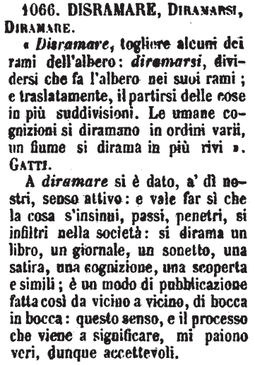 A diramare si è dato, a' dì nostri, senso attivo: e vale far sì che la cosa s'insinui, passi, penetri, si infiltri nella società: si dirama un libro, un giornale, un sonetto, una satira, una cognizione, una scoperta e simili; è un modo di pubblicazione fatta così da vicino a vicino, di bocca in bocca: questo senso, e il processo che viene a significare, mi paiono veri, dunque accettevoli. [immagine] |