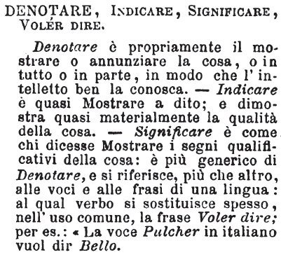 | Denotare, Indicare, Significare, Voler dire - Denotare è propriamente il mostrare o annunziare la cosa, o in tutto o in parte, in modo che l'intelletto ben lo conosca. - Indicare è quasi Mostrare a dito; e dimostra quasi materialmente la qualità della cosa. - Significare è come chi dicesse Mostrare i segni qualificativi della cosa: è più generico di Denotare, e si riferisce, più che altro, alle voci e alle frasi di una lingua: al qual verbo si sostituisce spesso, nell'uso comune, la frase Voler dire; per es.: «La voce Pulcher in italiano vuol dir Bello. [immagine] |