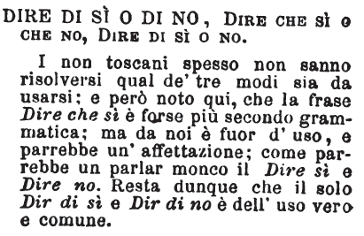 | Dire di sì o di no, Dire che sì o che no, Dire di sì o no - I non toscani spesso non sanno risolversi qual de' tre modi sia da usarsi; e però noto qui, che la frase Dire che sì è forse più secondo grammatica; ma da noi è fuor d'uso, e parrebbe un'affettazione; come parrebbe un parlar monco il Dire sì e Dire no. Resta dunque che il solo Dir di sì e Dir di no è dell'uso vero e comune. [immagine] |