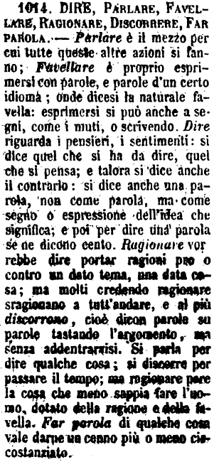 | Dire, Parlare, Favellare, Ragionare, Discorrere, Far parola - Parlare è il mezzo per cui tutte queste altre azioni si fanno; Favellare è proprio esprimersi con parole, e parole d'un certo idioma; onde dicesi la naturale favella: esprimersi si può anche a segni, come i muti, o scrivendo. Dire riguarda i pensieri, i sentimenti: si dice quel che si ha da dire, quel che si pensa; e talora si dice anche il contrario: si dice anche una parola, non come parola, ma come segno o espressione dell'idea che significa; e poi per dire una parola se ne dicono cento. Ragionare vorrebbe dire portar ragioni pro o contro un dato tema, una data cosa; ma molti credendo ragionare sragionano a tutt'andare, e al più discorrono, cioè dicon parole su parole tastando l'argomento, ma senza addentrarvisi. Si parla per dire qualche cosa; si discorre per passare il tempo; ma ragionare pare la cosa che meno sappia fare l'uomo, dotato della ragione e della favella. Far parola di qualche cosa vale darne un cenno più o meno circostanziato. [immagine] |
