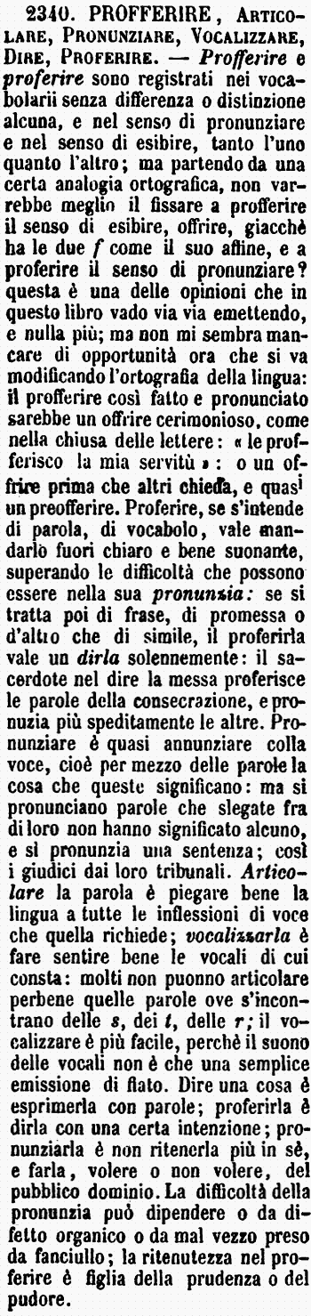 | Profferire, Articolare, Pronunziare, Vocalizzare, Dire, Proferire - Profferire e proferire sono registrati nei vocabolarii senza differenza o distinzione alcuna, e nel senso di pronunziare e nel senso di esibire, tanto l'uno quanto l'altro; ma partendo da una certa analogia ortografica, non varrebbe meglio il fissare a profferire il senso di esibire, offrire, giacchè ha le due f come il suo affine, e a proferire il senso di pronunziare? questa è una delle opinioni che in questo libro vado via via emettendo, e nulla più; ma non mi sembra mancare di opportunità ora che si va modificando l'ortografia della lingua: il profferire così fatto e pronunciato sarebbe un offrire cerimonioso, come nella chiusa delle lettere: «le profferisco la mia servitù»: o un offrire prima che altri chieda, e quasi un preofferire. Proferire, se s'intende di parola, di vocabolo, vale mandarlo fuori chiaro e bene suonante, superando le difficoltà che possono essere nella sua pronunzia: se si tratta poi di frase, di promessa o d'altro che di simile, il proferirla vale un dirla solennemente: il sacerdote nel dire la messa proferisce le parole della consecrazione, e pronuzia più speditamente le altre. Pronunziare è quasi annunziare colla voce, cioè per mezzo delle parole la cosa che queste significano: ma si pronunciano parole che slegate fra di loro non hanno significato alcuno, e si pronunzia una sentenza; così i giudici dai loro tribunali. Articolare la parola è piegare bene la lingua a tutte le inflessioni di voce che quella richiede; vocalizzarla è fare sentire bene le vocali di cui consta: molti non puonno articolare perbene quelle parole ove s'incontrano delle s, dei t, delle r; il vocalizzare è più facile, perchè il suono delle vocali non è che una semplice emissione di fiato. Dire una cosa è esprimerla con parole; proferirla è dirla con una certa intenzione; pronunziarla è non ritenerla più in sè, e farla, volere o non volere, del pubblico dominio. La difficoltà della pronunzia può dipendere o da difetto organico o da mal vezzo preso da fanciullo; la ritenutezza nel proferire è figlia della prudenza o del pudore. [immagine] |