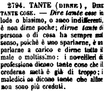 | Tante (dirne), Dire tante cose - Dire tante cose in lode o biasimo, o anco indifferenti, è non dirne poche; dirne tante di persona o di cosa ha sempre mal senso, poichè è uno sparlarne, è un parlarne a carico e dirne tutto il male o moltissimo: i novellieri di professione dicono tante cose che il crederne metà è già di troppo; i maledici ne dicono tante che alfine non sono più creduti. [immagine] |