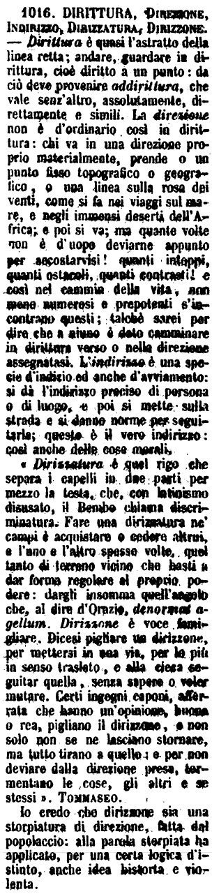 | Dirittura, Direzione, Indirizzo, Dirizzatura, Dirizzone - Dirittura è quasi l'astratto della linea retta; andare, guardare in dirittura, cioè diritto a un punto: da ciò deve provenire addirittura, che vale senz'altro, assolutamente, direttamente e simili. La direzione non è d'ordinario così in dirittura: chi va in una direzione proprio materialmente, prende o un punto fisso topografico o geografico, o una linea sulla rosa dei venti, come si fa nei viaggi sul mare, e negli immensi deserti dell'Africa; e poi si va; ma quante volte non è d'uopo deviarne appunto per accostarvisi! quanti intoppi, quanti ostacoli, quanti contrasti! e così nel cammin della vita, non meno numerosi e prepotenti s'incontrano questi; talchè sarei per dire che a niuno è dato camminare in dirittura verso o nella direzione assegnatasi. L'indirizzo è una specie d'indizio ed anche d'avviamento: si dà l'indirizzo preciso di persona o di luogo, e poi si mette sulla strada e si danno norme per seguitarla; questo è il vero indirizzo: così anche delle cose morali.