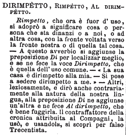 | Dirimpetto, Rimpetto, Al dirimpetto - Rimpetto, che ora è fuor d'uso, si adoprò a significare cosa o persona che sta dinanzi o a noi, o ad altra cosa, con la fronte voltata verso la fronte nostra o di quella tal cosa. - A questo avverbio si aggiunse la preposizione Di per localizzar meglio, e se ne fece la voce Dirimpetto, che è quella dell'uso comune. - «La sua casa è dirimpetto alla mia. - Si pose a sedere dirimpetto a me.» - Altri, leziosamente, e dirò anche contrariamente alla natura della nostra lingua, alla preposizione Di ne aggiunse un'altra e ne fece Al dirimpetto, che è bene fuggirla. Il contraffattore della cronica attribuita al Compagni, la usò, e usandola, si scoprì per falso Trecentista. [immagine] |