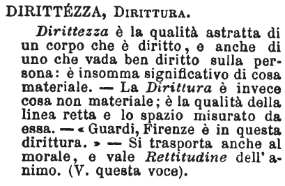 | Dirittezza, Dirittura - Dirittezza è la qualità astratta di un corpo che è diritto, e anche di uno che vada ben diritto sulla persona: è insomma significativo di cosa materiale. - La Dirittura è invece cosa non materiale; è la qualità della linea retta e lo spazio misurato da essa. - «Guardi, Firenze è in questa dirittura.» - Si trasporta anche al morale, e vale Rettitudine dell'animo. (V. questa voce). [immagine] |