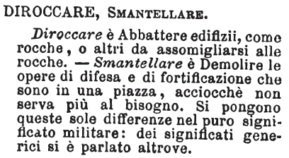 | Diroccare, Smantellare - Diroccare è Abbattere edifizii, come rocche, o altri da assomigliarsi alle rocche. - Smantellare è Demolire le opere di difesa e di fortificazione che sono in una piazza, acciocchè non serva più al bisogno. Si pongono queste sole differenze nel puro significato militare: dei significati generici si è parlato altrove. [immagine] |