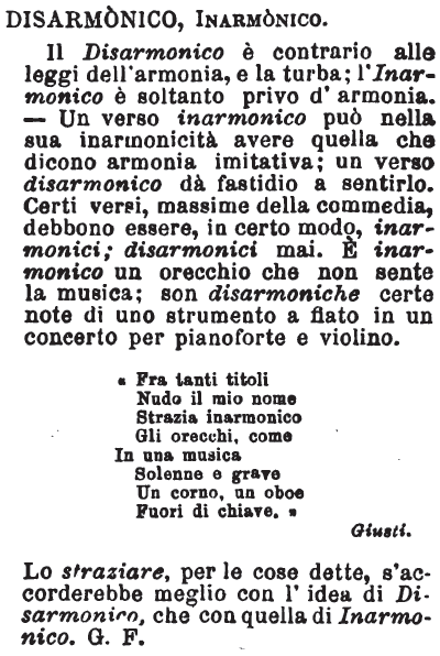 | Disarmonico, Inarmonico - Il Disarmonico è contrario alle leggi dell'armonia, e la turba; l'Inarmonico è soltanto privo d'armonia. - Un verso inarmonico può nella sua inarmonicità avere quella che dicono armonia imitativa; un verso disarmonico dà fastidio a sentirlo. Certi versi, massime della commedia, debbono essere, in certo modo, inarmonici; disarmonici mai. E' inarmonico un orecchio che non sente la musica; son disarmoniche certe note di uno strumento a fiato in un concerto per pianoforte e violino.