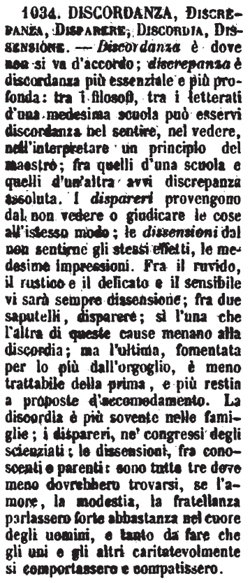 | Discordanza, Discrepanza, Disparere, Discordia, Dissensione - Discordanza è dove non si va d'accordo; discrepanza è discordanza più essenziale e più profonda: tra i filosofi, tra i letterati d'una medesima scuola può esservi discordanza nel sentire, nel vedere, nell'interpretare un principio del maestro; fra quelli d'una scuola e quelli d'un'altra avvi discrepanza assoluta. I dispareri provengono dal non vedere o giudicare le cose all'istesso modo; le dissensioni dal non sentirne gli stessi effetti, le medesime impressioni. Fra il ruvido, il rustico e il delicato e il sensibile vi sarà sempre dissensione; fra due saputelli, disparere; sì l'una che l'altra di queste cause menano alla discordia; ma l'ultima, fomentata per lo più dall'orgoglio, è meno trattabile della prima, e più restia a proposte d'accomodamento. La discordia è più sovente nelle famiglie; i dispareri, ne' congressi degli scienziati; le dissensioni, fra conoscenti e parenti: sono tutte tre dove meno dovrebbero trovarsi, se l'amore, la modestia, la fratellanza parlassero forte abbastanza nel cuore degli uomini, e tanto da fare che gli uni e gli altri caritatevolmente si comportassero e compatissero. [immagine] |