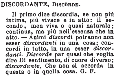 | Discordante, Discorde - Il primo dice discordia, se non più intima, più vivace e in atto: il secondo, men viva e quasi naturale; continua, ma più nell'essenza che in atto. - Animi discordi potranno non esser discordanti in una cosa; concordi in tutto, in una esser discordanti. Discorde par quasi che voglia dire Di sentimento, di cuore diverso; discordante, Che non si accorda in questa o in quella cosa. G. F. [immagine] |