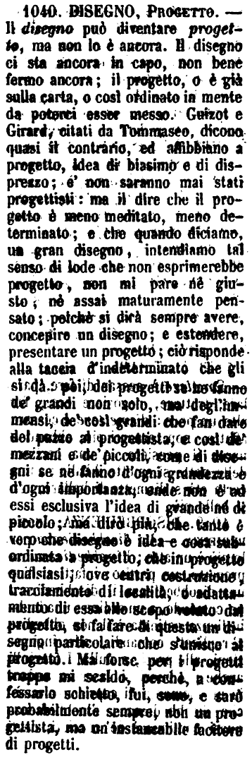 | Disegno, Progetto - Il disegno può diventare progetto, ma non lo è ancora. Il disegno ci sta ancora in capo, non bene fermo ancora; il progetto, o è già sulla carta, o così ordinato in mente da poterci esser messo. Guizot e Girard, citati da Tommaseo, dicono quasi il contrario, ed affibbiano a progetto, idea di biasimo e di disprezzo; e' non saranno mai stati progettisti: ma il dire che il progetto è meno meditato, meno determinato; e che quando diciamo, un gran disegno, intendiamo tal senso di lode che non esprimerebbe progetto, non mi pare nè giusto, nè assai maturamente pensato; poichè si dirà sempre avere, concepire un disegno; e estendere, presentare un progetto; ciò risponde alla taccia d'indeterminato che gli si dà poi, dei progetti se ne fanno de' grandi non solo, ma degl'immensi, de' così grandi che fan dare del pazzo al progettista, e così de' mezzani e de' piccoli, come di disegni se ne fanno d'ogni grandezza e d'ogni importanza, onde non è ad essi esclusiva l'idea di grande nè di piccolo; ma dirò più, che tanto è vero che disegno è idea e cosa subordinata a progetto; che in progetto qualsiasi, ove entri costruzione, tracolamento di località, o adattamento di essa allo scopo voluto dal progetto, si fa fare di questa un disegno particolare che s'unisce al progetto. Ma forse per i progetti troppo mi scaldo, perchè, a confessarlo schietto, fui, sono, e sarò probabilmente sempre, non un progettista, ma un instancabile facitore di progetti. [immagine] |