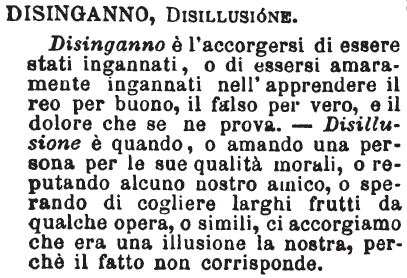 | Disinganno, Disillusione - Disinganno è l'accorgersi di essere stati ingannati, o di essersi amaramente ingannati nell'apprendere il reo per buono, il falso per vero, e il dolore che se ne prova. - Disillusione è quando, o amando una persona per le sue qualità morali, o reputando alcuno nostro amico, o sperando di cogliere larghi frutti da qualche opera, o simili, ci accorgiamo che era una illusione la nostra, perchè il fatto non corrisponde. [immagine] |