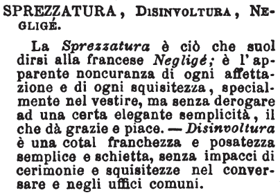 Sprezzatura, Disinvoltura, Negligé - La Sprezzatura è ciò che suol dirsi alla francese Negligé; è l'apparente noncuranza di ogni affettazione e di ogni squisitezza, specialmente nel vestire, ma senza derogare ad una certa elegante semplicità, il che dà grazie e piace. - Disinvoltura è una cotal franchezza e posatezza semplice e schietta, senza impacci di cerimonie e squisitezze nel conversare e negli uffici comuni. [immagine]