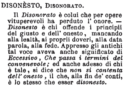 | Disonesto, Disonorato - Il Disonorato è colui che per opere vituperevoli ha perduto l'onore. - Disonesto è chi offende i principii del giusto e dell'onesto, mancando alla lealtà, ai proprii doveri, alla data parola, alla fede. Appresso gli antichi tal voce aveva anche significato di Eccessivo, Che passa i termini del convenevole; ed anche adesso di chi è tale, si dice che non si contenta dell'onesto, il che, alla fin de' conti, è lo stesso che esser disonesto. [immagine] |