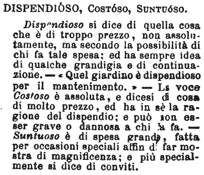 | Dispendioso, Costoso, Suntuoso - Dispendioso si dice di quella cosa che è di troppo prezzo, non assolutamente, ma secondo la possibilità di chi fa tale spesa; ed ha sempre idea di qualche grandigia e di continuazione. - « Quel giardino è dispendioso per il mantenimento. » - La voce Costoso è assoluta, e dicesi di cosa di molto prezzo, ed ha in sé la ragione del dispendio; e può non esser grave o dannosa a chi la fa. - Suntuoso è di spesa grande, fatta per occasioni speciali affin di far mostra di magnificenza; e più specialmente si dice di conviti. [immagine] |