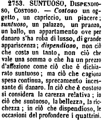 | Suntuoso, Dispendioso, Costoso - Costoso un oggetto, un capriccio, un piacere; suntuoso, un palazzo, un pranzo, un ballo, un appartamento ove per danaro s'ha roba di lusso, di grande appariscenza; dispendioso, non ciò che costa un tanto, non ciò che vale una somma o che ha un prezzo d'affezione come ciò che è dichiarato suntuoso; ma ciò che cagiona spesa continua, sprecamento incessante di danaro. In ciò che è costoso si considera la carezza relativa; in ciò che suntuoso, la bellezza, la ricchezza; in ciò che dispendioso, le occasioni del profondere i quattrini. [immagine] |