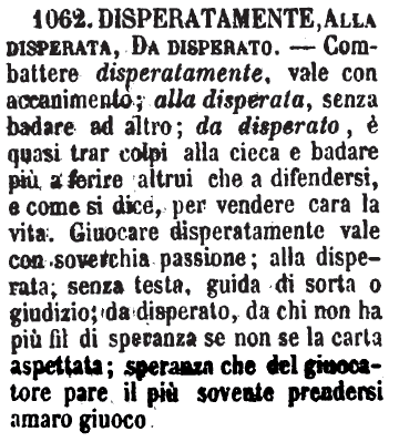 Disperatamente, Alla disperata, Da disperato - Combattere disperatamente, vale con accanimento; alla disperata, senza badare ad altro; da disperato, è quasi trar colpi alla cieca e badare più a ferire altrui che a difendersi, e come si dice, per vendere cara la vita. Giuocare disperatamente vale con soverchia passione; alla disperata, senza testa, guida di sorta o giudizio; da disperato, da chi non ha più fil di speranza se non se la carta aspettata; speranza che del giuocatore pare il più sovente prendersi amaro giuoco. [immagine]