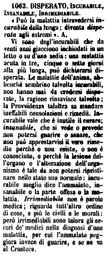 | Disperato, Incurabile, Insanabile, Irrimediabile - «Può la malattia intravedersi incurabile dalla lunga; diventa disperata agli estremi». A.