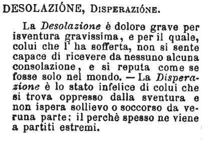 | Desolazione, Disperazione - La Desolazione è dolore grave per isventura gravissima, e per il quale, colui che l'ha sofferta, non si sente capace di ricevere da nessuno alcuna consolazione, e si reputa come se fosse solo nel mondo. - La Disperazione è lo stato infelice di colui che si trova oppresso dalla sventura e non ispera sollievo o soccorso da veruna parte; il perchè spesso ne viene a partiti estremi. [immagine] |