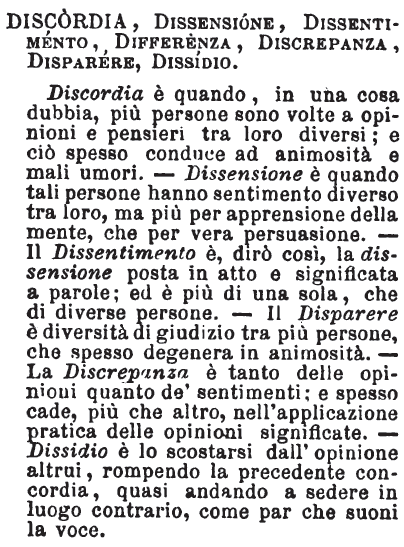 | Discordia, Dissensione, Dissentimento, Differenza, Discrepanza, Disparere, Dissidio - Discordia è quando, in una cosa dubbia, più persone sono volte a opinioni e pensieri tra loro diversi; e ciò spesso conduce ad animosità e mali umori. - Dissensione è quando tali persone hanno sentimento diverso tra loro, ma più per apprensione della mente, che per vera persuasione. - Il Dissentimento è, dirò così, la dissensione posta in atto e significata a parole; ed è più di una sola, che di diverse persone. - Il Disparere è diversità di giudizio tra più persone, che spesso degenera in animosità. - La Discrepanza è tanto delle opinioni quanto de' sentimenti; e spesso cade, più che altro, nell'applicazione pratica delle opinioni significate. - Dissidio è lo scostarsi dall'opinione altrui, rompendo la precedente concordia, quasi andando a sedere in luogo contrario, come par che suoni la voce. [immagine] |