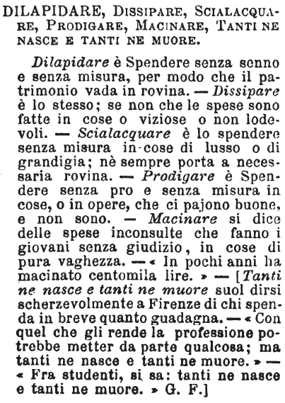 | Dilapidare, Dissipare, Scialacquare, Prodigare, Macinare, Tanti ne nasce e tanti ne muore - Dilapidare è Spendere senza senno e senza misura, per modo che il patrimonio vada in rovina. - Dissipare è lo stesso; se non che le spese sono fatte in cose o viziose o non lodevoli. - Scialacquare è lo spendere senza misura in cose di lusso o di grandigia; né sempre porta a necessaria rovina. - Prodigare è Spendere senza pro e senza misura in cose, o in opere, che ci pajono buone, e non sono. - Macinare si dice delle spese inconsulte che fanno i giovani senza giudizio, in cose di pura vaghezza. - «In pochi anni ha macinato centomila lire.» - [Tanti ne nasce e tanti ne muore suol dirsi scherzevolmente a Firenze di chi spenda in breve quanto guadagna. - «Con quel che gli rende la professione potrebbe metter da parte qualcosa; ma tanti ne nasce e tanti ne muore.» - «Fra studenti, si sa: tanti ne nasce e tanti ne muore.» G. F.] [immagine] |