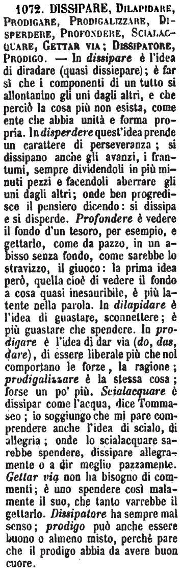| Dissipare, Dilapidare, Prodigare, Prodigalizzare, Disperdere, Profondere, Scialacquare, Gettar via; Dissipatore, Prodigo - In dissipare è l'idea di diradare (quasi dissiepare); è far sì che i componenti di un tutto si allontanino gli uni dagli altri, e che perciò la cosa più non esista, come ente che abbia unità e forma propria. In disperdere quest'idea prende un carattere di perseveranza; si dissipano anche gli avanzi, i frantumi, sempre dividendoli in più minuti pezzi e facendoli aberrare gli uni dagli altri; onde ben progredisce il pensiero dicendo: si dissipa e si disperde. Profondere è vedere il fondo d'un tesoro, per esempio, e gettarlo, come da pazzo, in un abisso senza fondo, come sarebbe lo stravizzo, il giuoco: la prima idea però, quella cioè di vedere il fondo a cosa quasi inesauribile, è più latente nella parola. In dilapidare è l'idea di guastare, sconnettere; è più guastare che spendere. In prodigare è l'idea di dar via (do, das, dare), di essere liberale più che nol comportano le forze, la ragione; prodigalizzare è la stessa cosa; forse un po' più. Scialacquare è dissipar come l'acqua, dice Tommaseo; io soggiungo che mi pare comprendere anche l'idea di scialo, di allegria; onde lo scialacquare sarebbe spendere, dissipare allegramente o a dir meglio pazzamente. Gettar via non ha bisogno di commenti; è uno spendere così malamente il suo, che tanto varrebbe il gettarlo. Dissipatore ha sempre mal senso; prodigo può anche essere buono o almeno misto, perchè pare che il prodigo abbia da avere buon cuore. [immagine] |